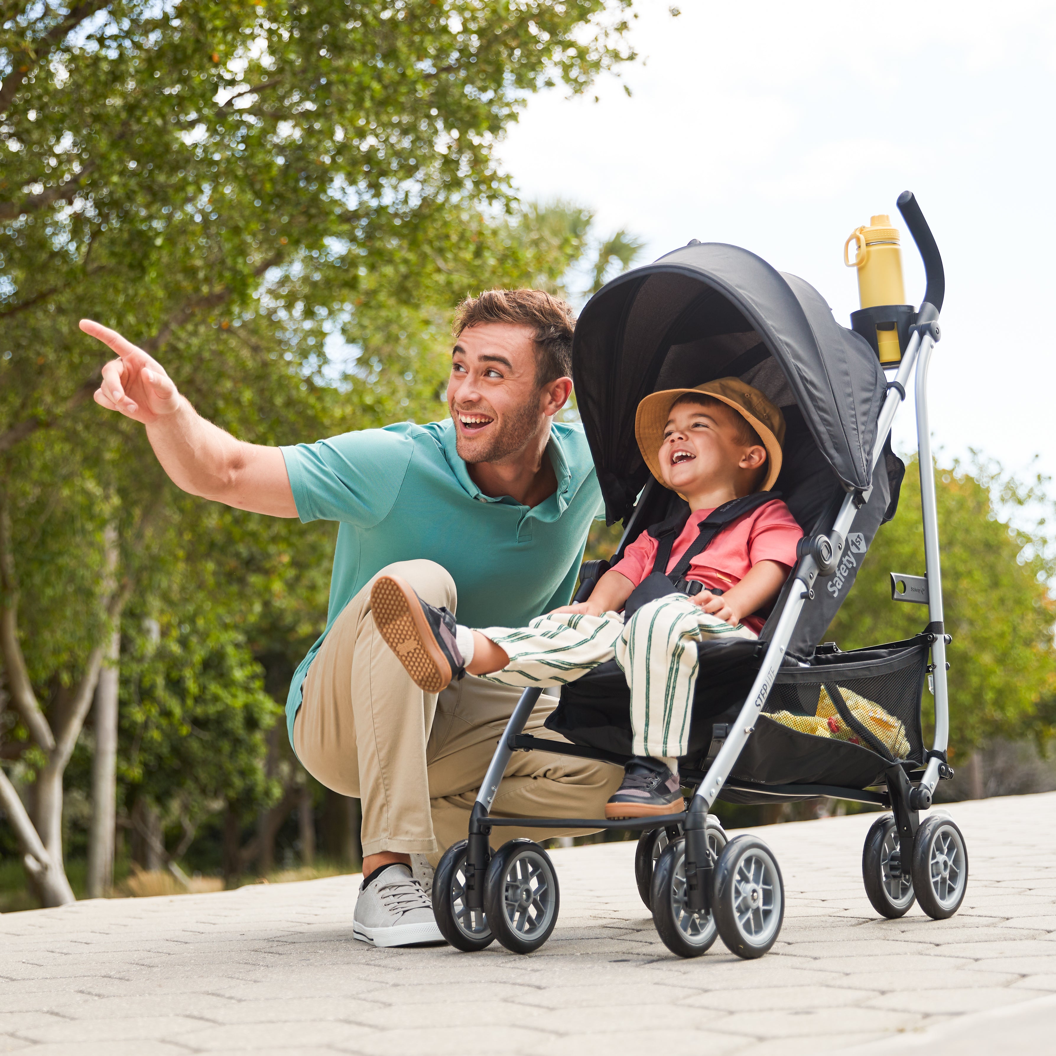 The Safety 1st Step Lite Compact Stroller lightens up every stroll with its compact size and ample storage space. With its plush foam handles and lightweight aluminum frame (at under 16.5 lbs.), you can zip around the grocery store, the park, or wherever you need to be. You can easily store the stroller in your trunk or tuck it away in the closet. It also conveniently folds up even if the canopy is extended.