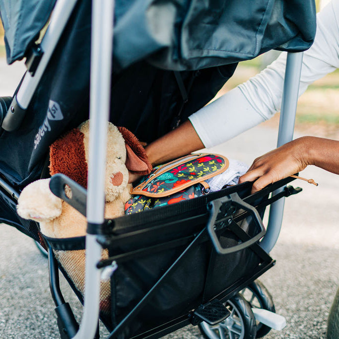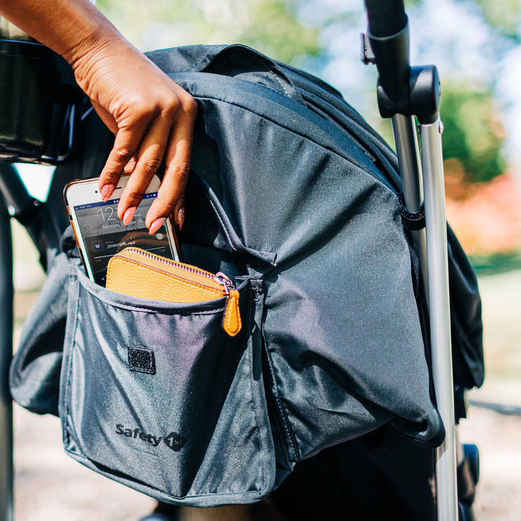 With the extra-large canopy, your child will sit comfortably in the shade even on sunny days. The peek-a-boo window lets you quickly look in and exchange a smile or two. There’s plenty of room in the storage basket for diapers, extra clothes, and everything you need along the way. You can also store small personal items in the covered pocket attached to the back of the seat.