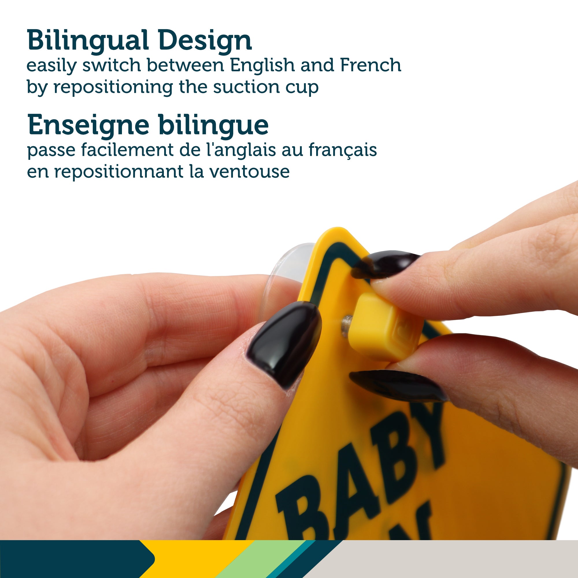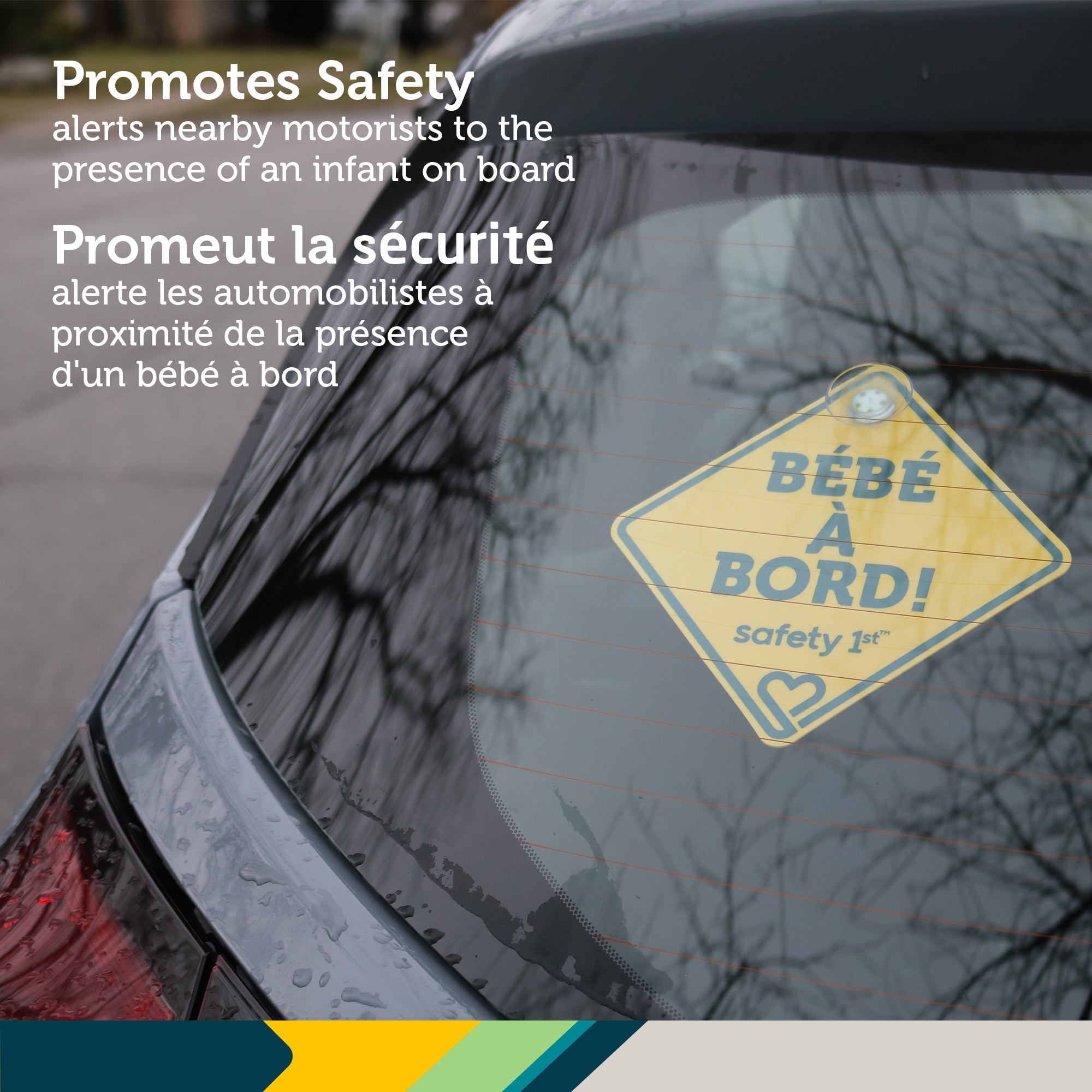 Now featuring an innovative bilingual design, the sign quickly switches between English and French. Simply reposition the suction cup by unscrewing the Safety 1st heart to display "Bébé à Bord!"