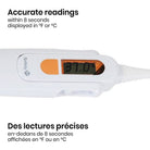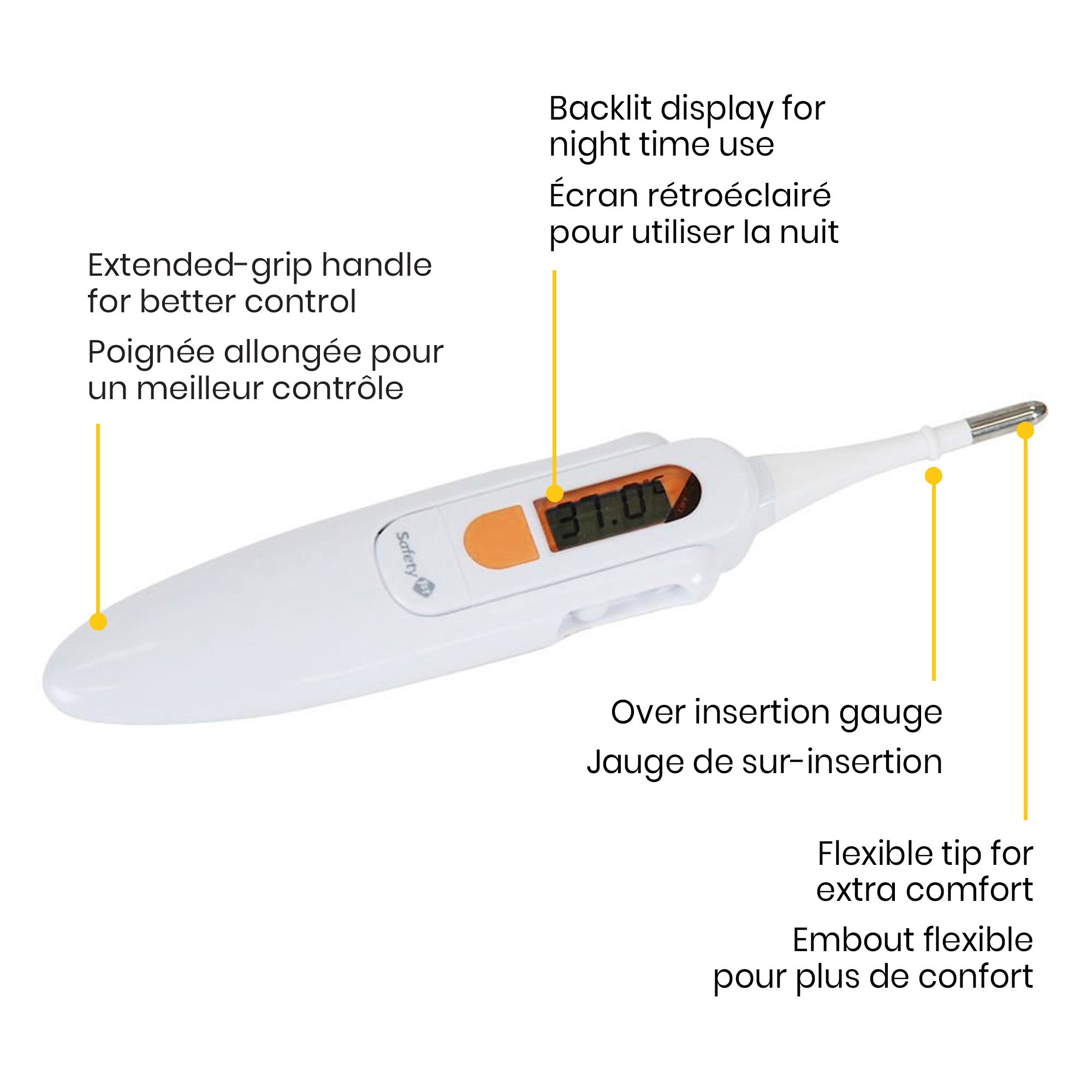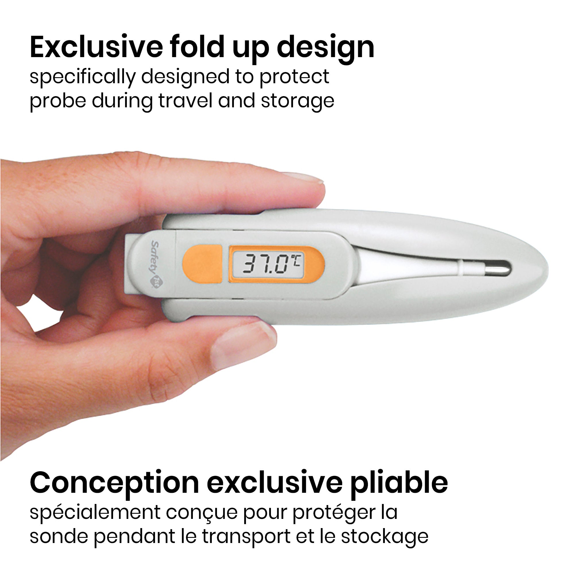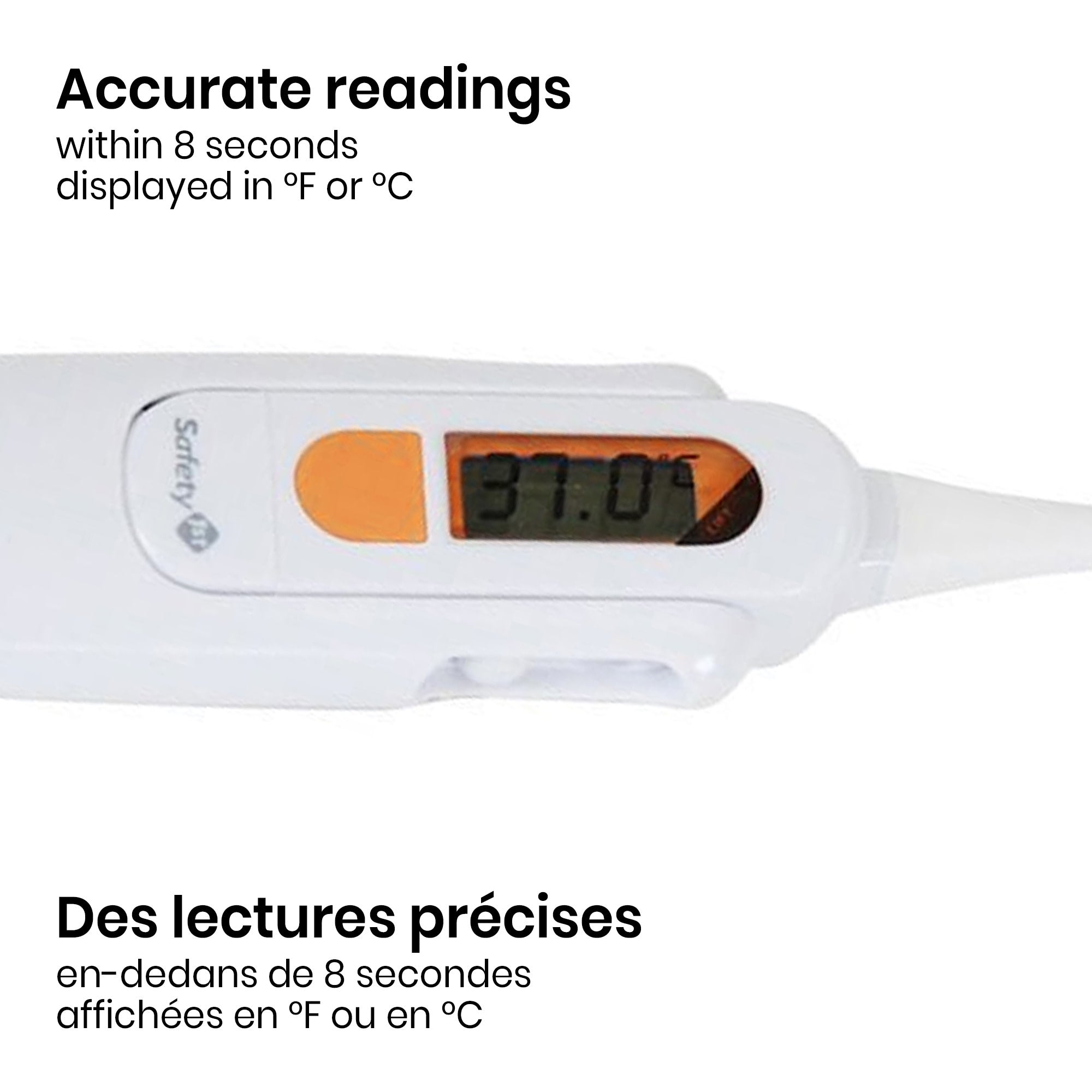 The Safety 1st 8 Second Flex Tip Folding Digital Thermometer is exactly what it says. A fast read, 8 second digital thermometer suitable for underarm, oral or rectal use with an exclusive Fold Up design to help protect the probe during travel and storage. The larger, backlit LCD display is convenient for parents to see, the flexible tip provides additional comfort for the child and the over insertion gauge assures parents of correct rectal positioning. The memory recall feature tracks the last reading. While the device comes with a long life battery, the auto-shut-off feature stretches battery life. All in all, this Safety 1st thermometer is just what you may need handy at home.