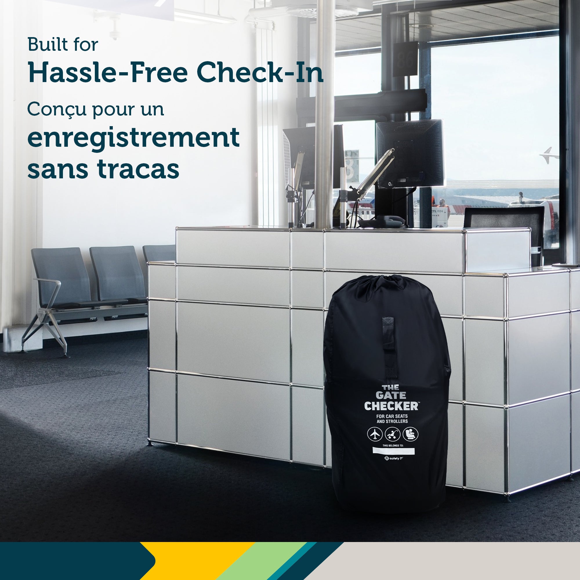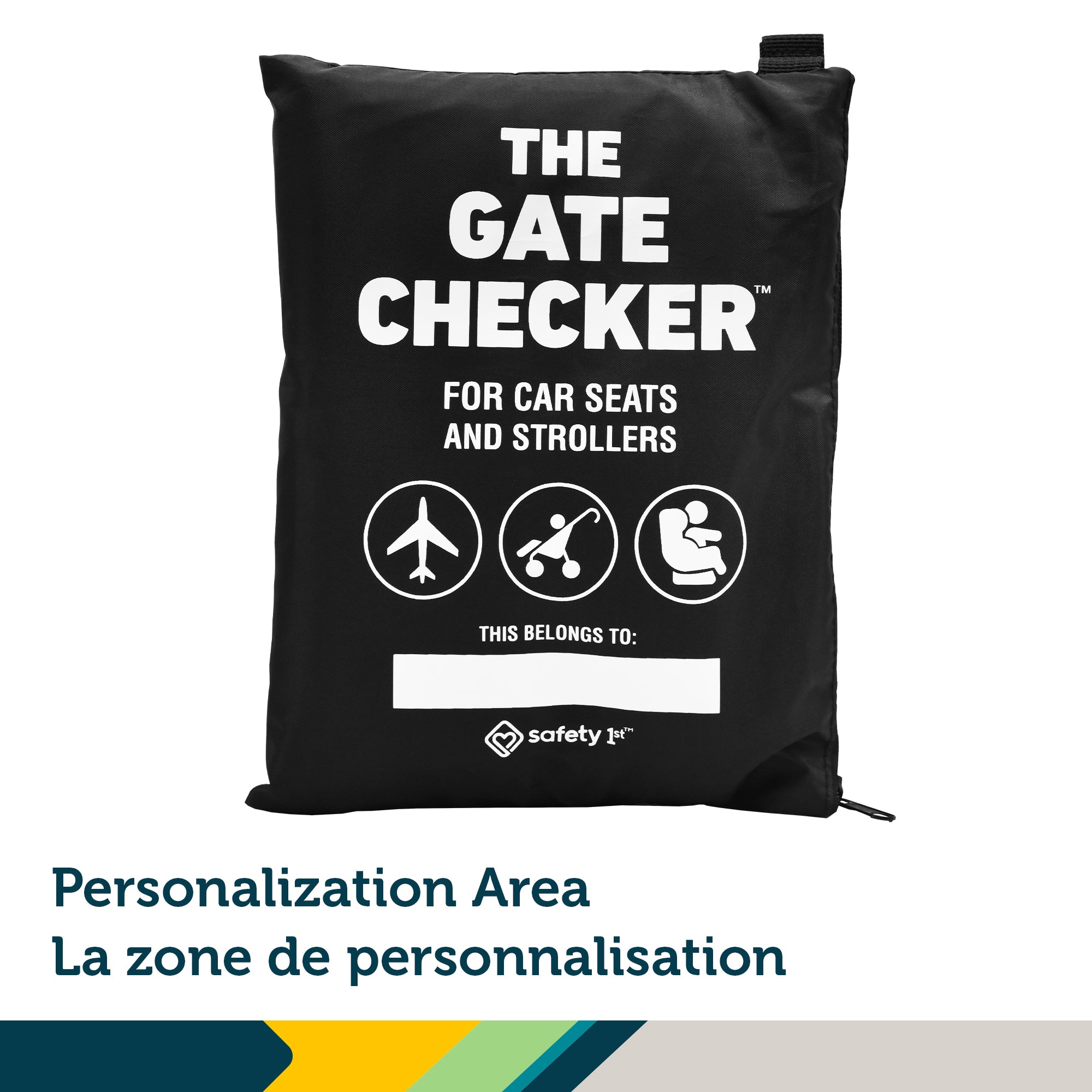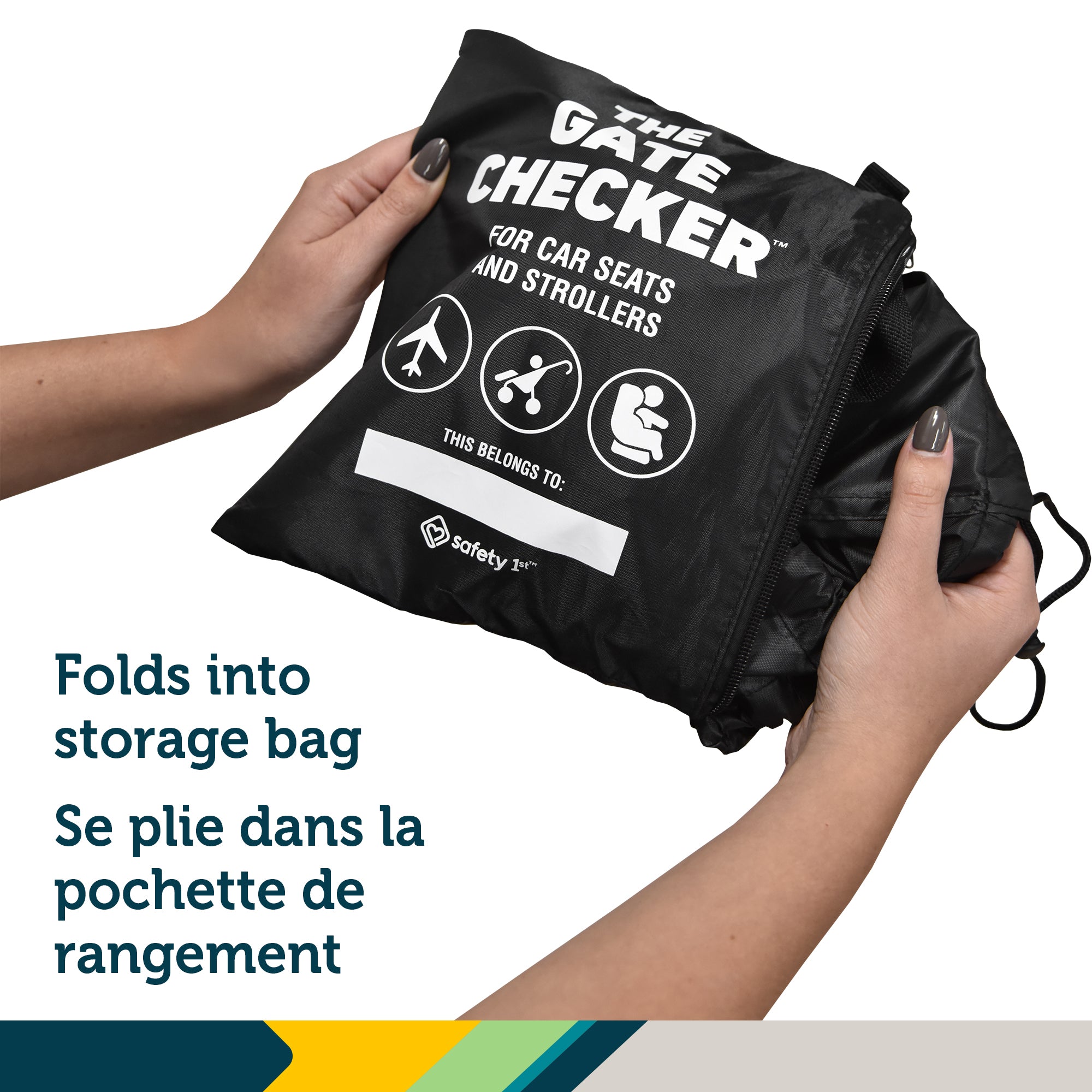Make traveling with a car seat or stroller easier with the Safety 1st Gate Check Car Seat & Stroller Bag. Designed for airplane travel, this durable, travel-friendly bag offers a universal fit for most car seats and standard-size strollers. The heavy-duty fabric helps protect your gear from dirt, damage, and germs, while the secure drawstring closure with toggle keeps everything safely contained. For added convenience, adjustable backpack straps and a front handle give you two easy ways to carry it through the airport. A writable ID box allows for quick identification, and when not in use, the bag folds neatly into its attached storage pouch. Wherever you're headed, take off with confidence knowing your gear is covered.
