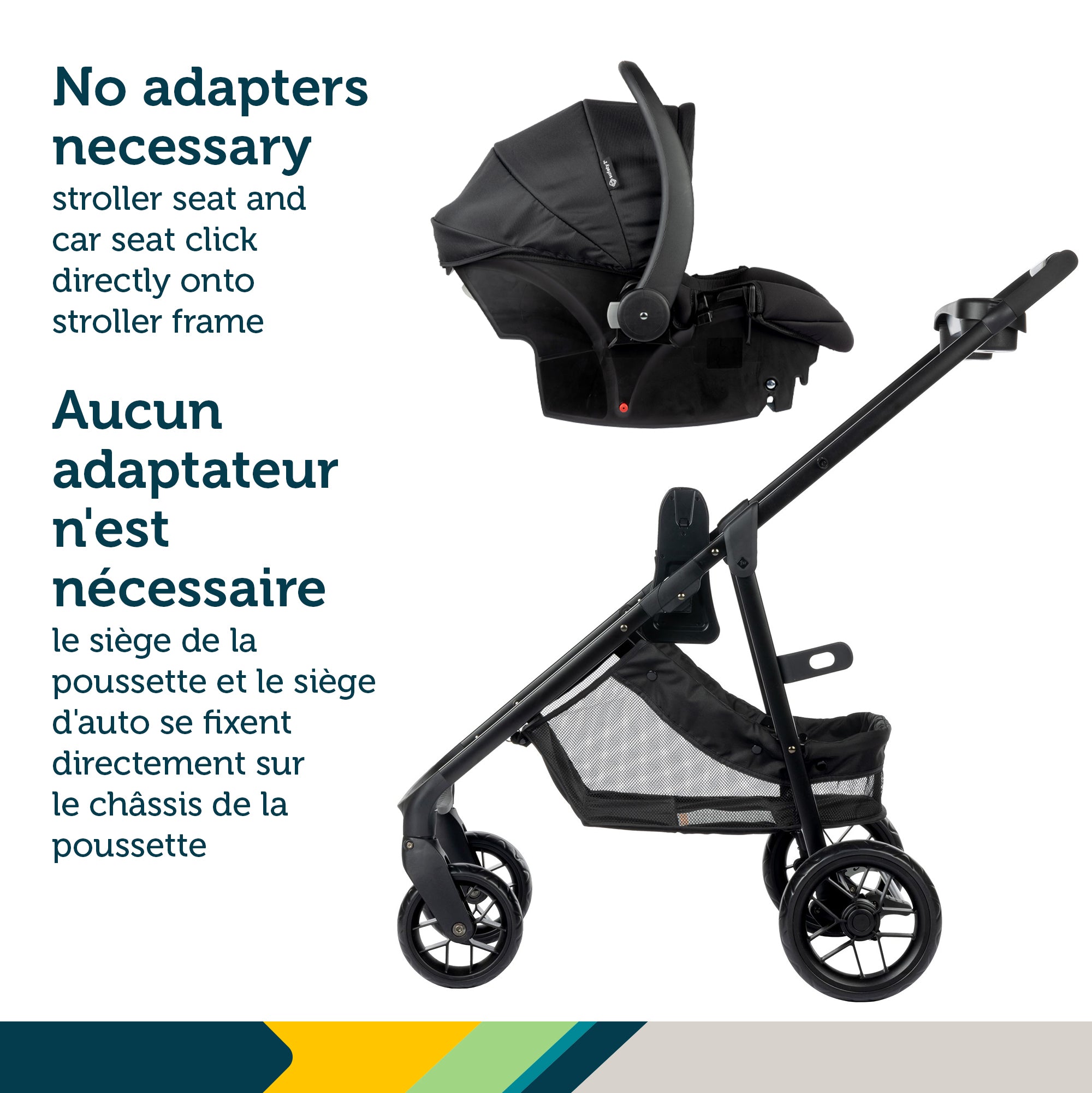 The stroller seat effortlessly converts into a carriage, providing ample space for infants to stretch out during a stroll. The car seat and stroller seat can be clicked into the stroller frame separately or together, with no additional adapters needed, providing you with all the options you need to go about your day.
