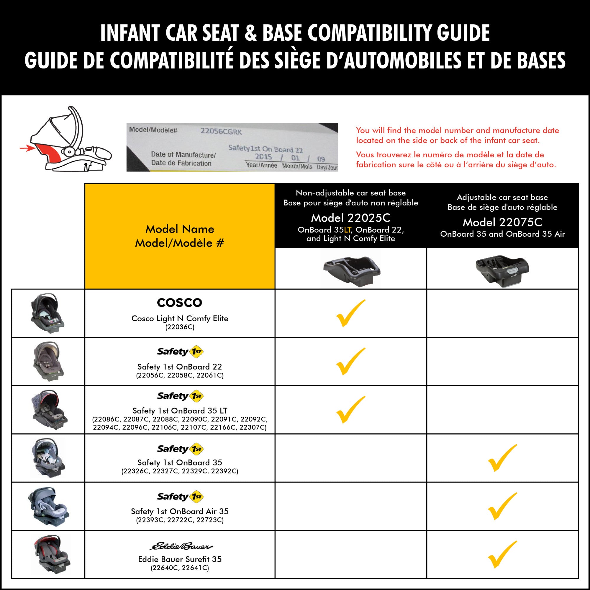 Always on the go? You have the Safety 1st Base, a convenient accessory, compatible with Safety 1st onBoard™35 Infant Car Seats, Lux by Safety 1st infant car seats, and Eddie Bauer SureFit 35 Car Seats. The 5 position adjustable base makes it ideal for use as a stay-in-car base for a secondary car. It is compact and is UAS equipped.