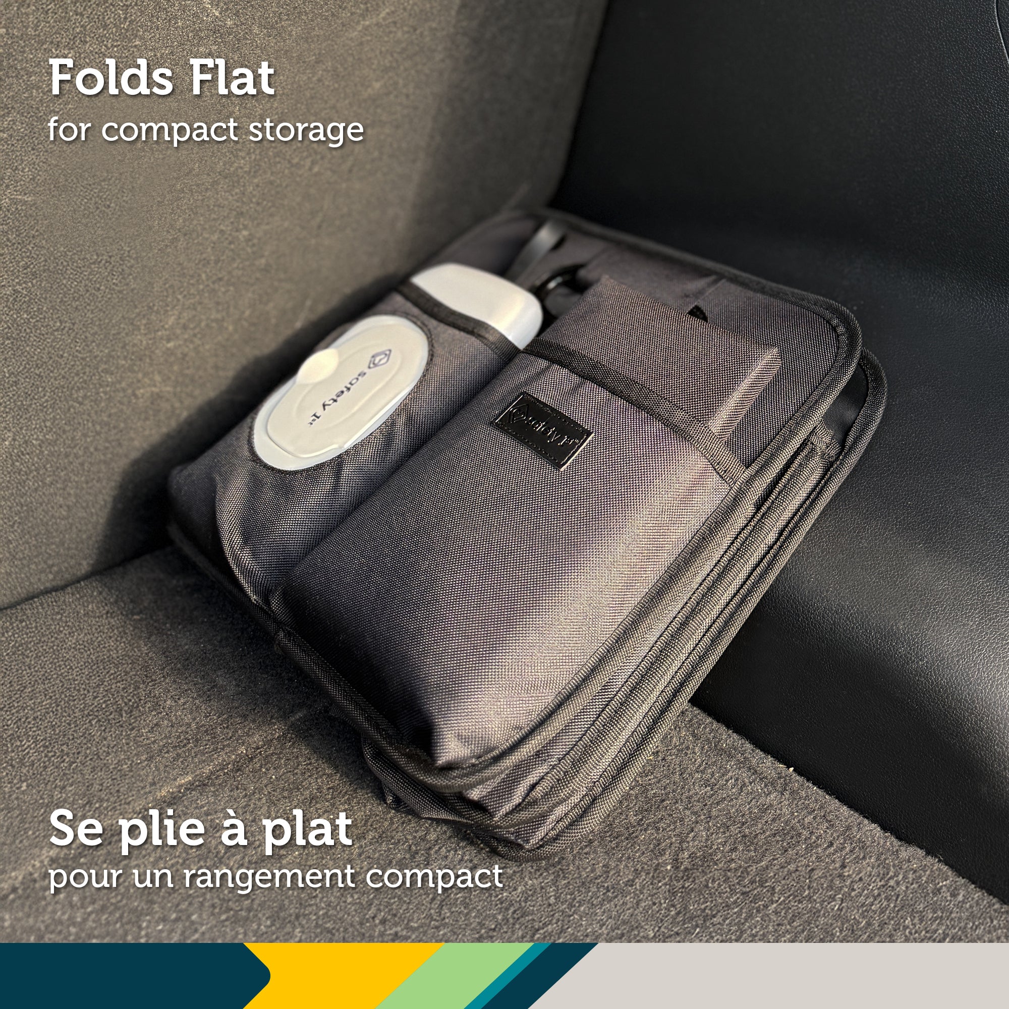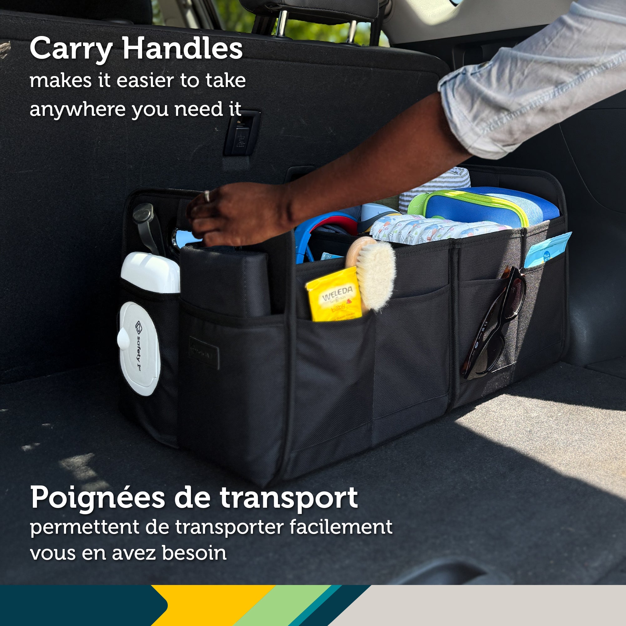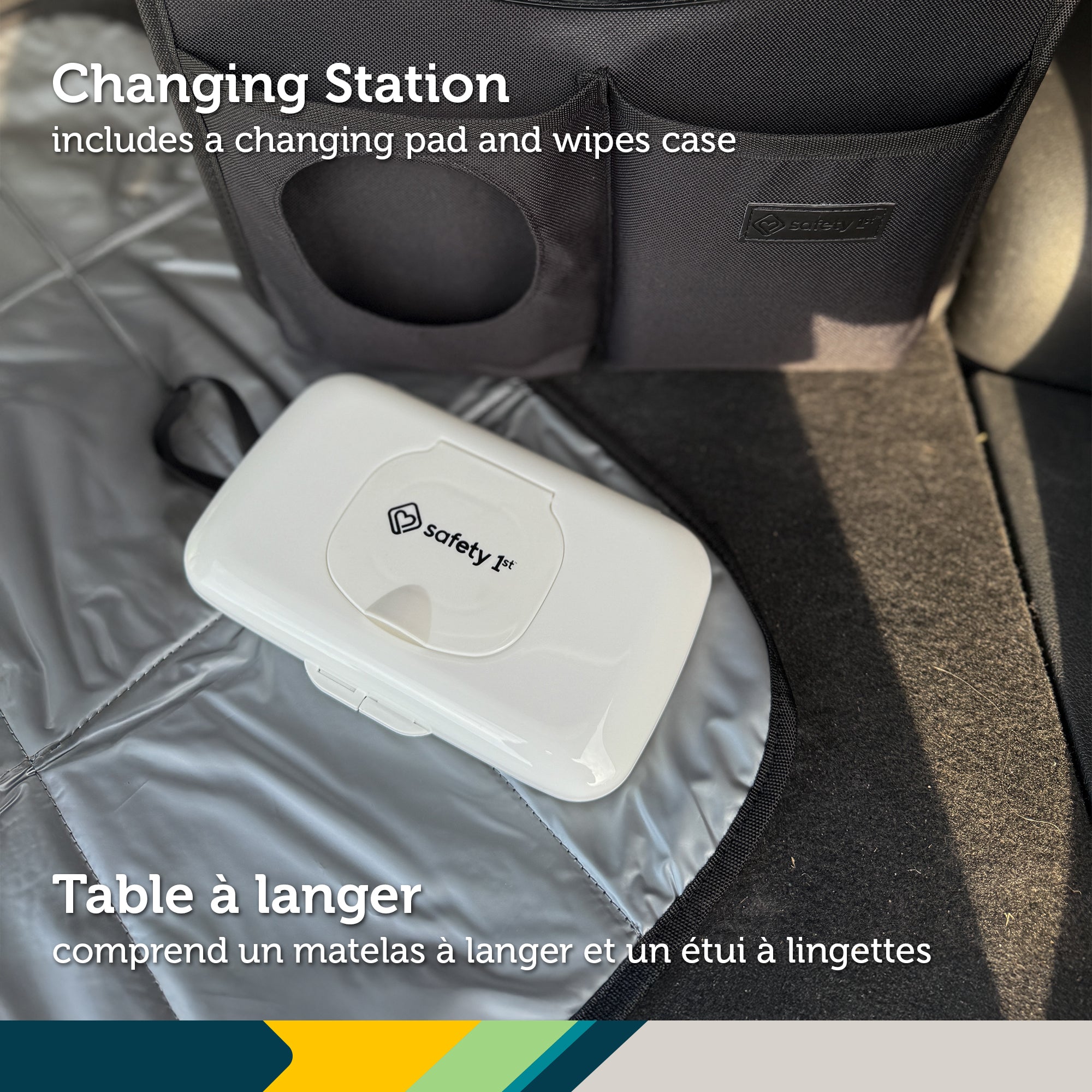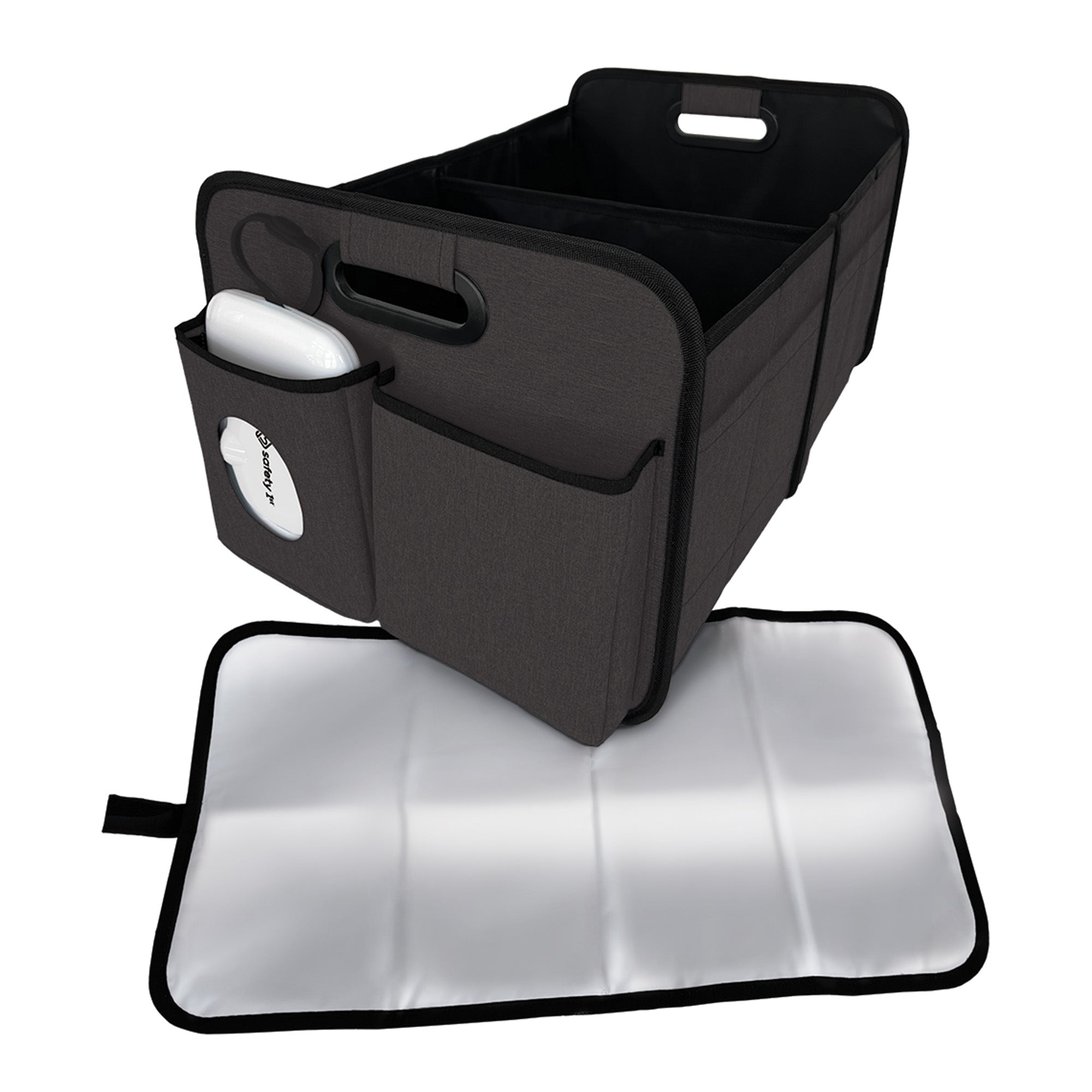 Stay prepared wherever the road takes you with the Safety 1st Trunk Organizer & Changing Station. This all-in-one car organizer includes a diaper changing pad and a wipes case with a built-in quick-access pocket, turning your trunk into a convenient baby changing station on the go. Designed for busy parents, it offers smart storage with two large interior compartments, four exterior side pockets, and a roomy front pocket. It's perfect for diapers, wipes, extra clothes, toys, and more. The removable divider lets you customize your setup, while built-in handles and a collapsible design make it easy to carry and store. Made from durable, easy-to-clean materials, the Safety 1st Trunk Organizer & Changing Station helps keep your car organized and your baby essentials always within reach.