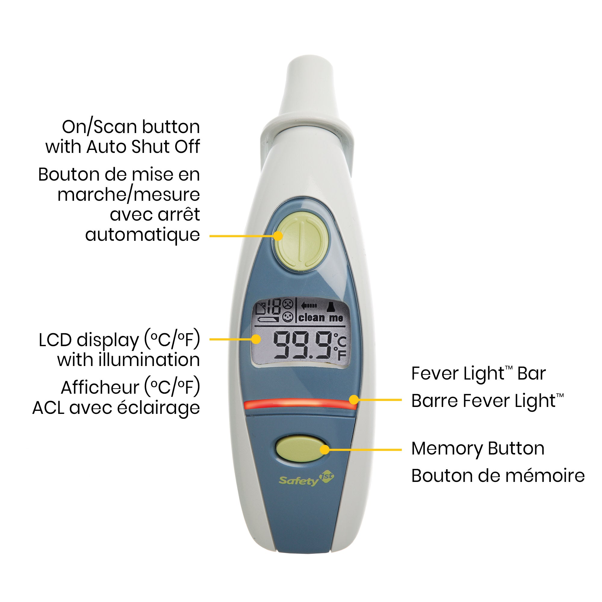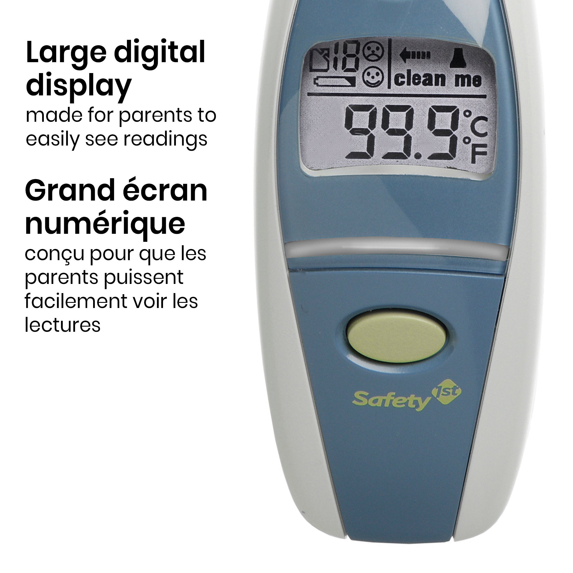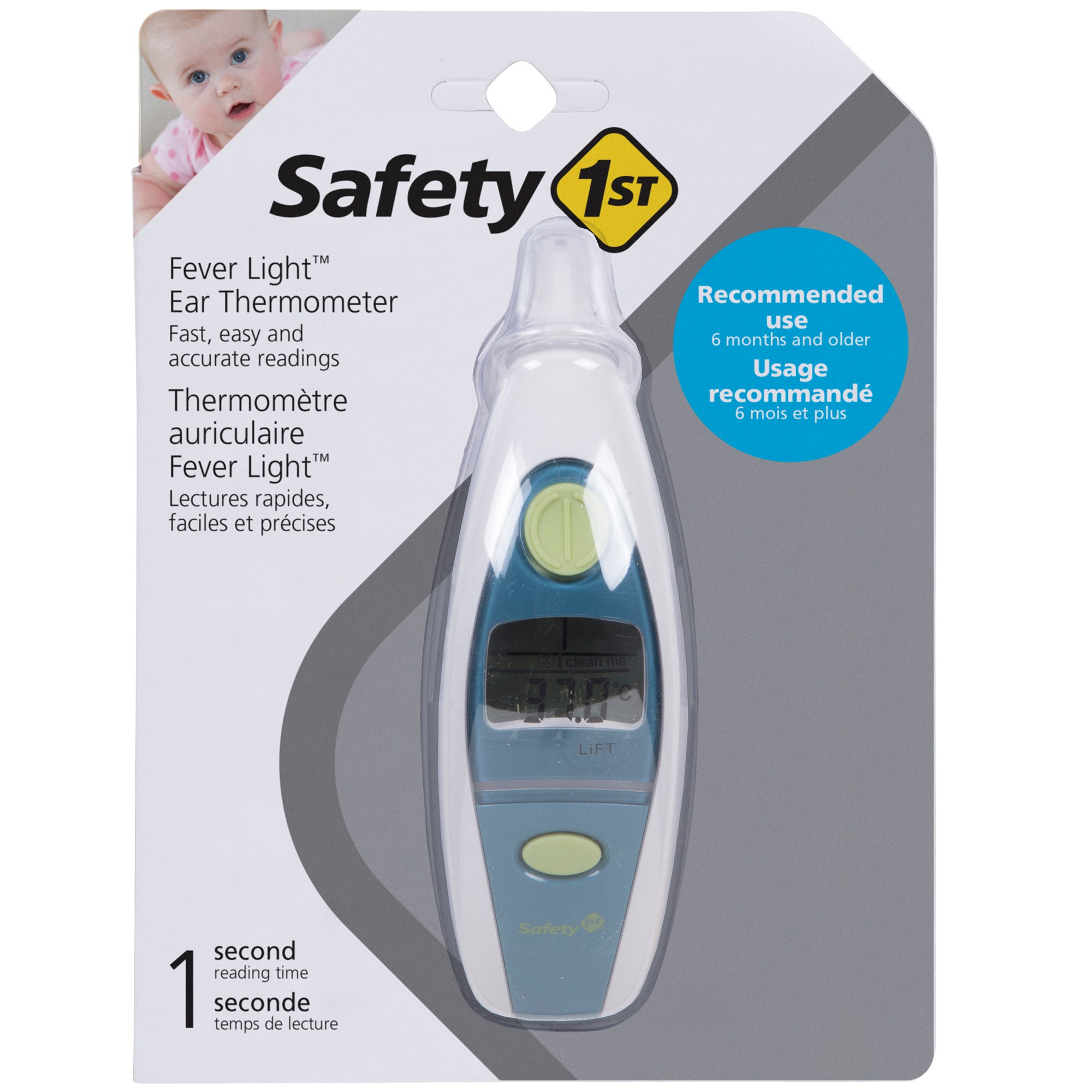 Lorsqu'il s'agit de la santé de votre bébé, vous souhaitez des informations rapides et précises. Le thermomètre auriculaire 1 seconde Safety 1 st Fever Light fournit exactement cela. Avec un grand écran numérique et notre barre Fever Light qui s'allume lorsque les enfants ont de la fièvre, vous saurez immédiatement si la température de votre enfant a dépassé la normale. Le thermomètre dispose également d'un rappel de mémoire pratique pour vous aider à suivre les 12 dernières lectures.