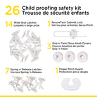 Le kit de sécurité pour portes et tiroirs Safety 1st est conçu pour sécuriser les portes et les tiroirs de votre maison. Les loquets à prise large aident à dissuader les enfants d'ouvrir les tiroirs et les armoires. Le verrou d'armoire SecureTech aide à dissuader les enfants d'ouvrir les armoires. Les couvercles de poignée de porte Grip n' Twist aident à dissuader les enfants d'ouvrir les portes. Les loquets à prise large aident à empêcher les enfants d'ouvrir les tiroirs et les armoires. La protection anti-pincement des doigts aide à empêcher les portes de se pincer ou de se fermer sur les petits doigts