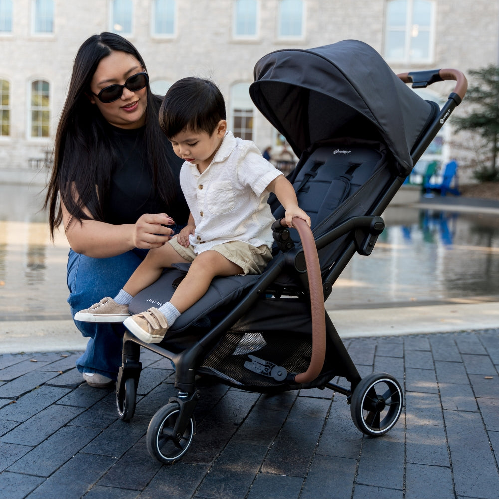 Où que vous alliez, la Spark Plus est idéale pour voyager grâce à son pliage compact et peu encombrant et à sa barre de protection double fonction faisant également office de poignée de transport. Pratique, portable et dotée de nombreuses fonctionnalités, c'est la poussette idéale au quotidien pour les familles modernes en déplacement.