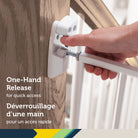 Conçue pour les parents actifs, la barrière s'ouvre facilement d'une seule main : il suffit de tourner le levier et de soulever. Ses charnières robustes permettent un contrôle personnalisé de l'ouverture : unidirectionnelle pour les escaliers ou bidirectionnelle pour l'accès entre les pièces. Une butée réglable assure une ouverture unidirectionnelle sûre en haut des escaliers, tandis qu'un bouton de déverrouillage rapide permet de retirer la barrière lorsqu'elle n'est pas utilisée.