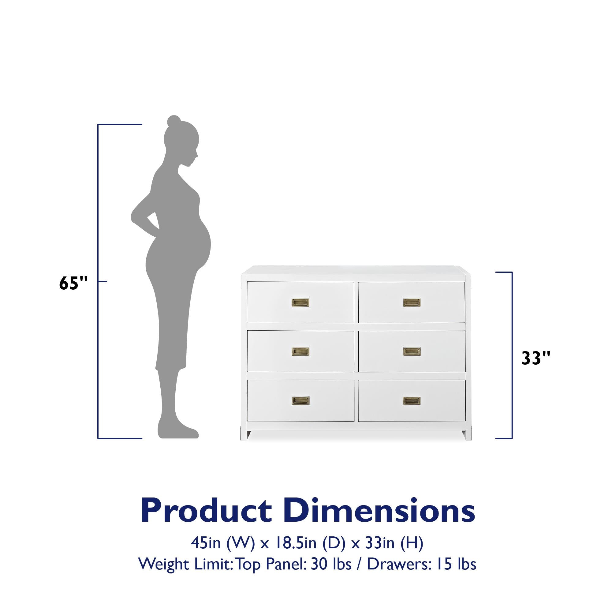 Create a nursery that exudes both joy and sophistication with the charming Miles 6-Drawer Dresser from Baby Relax. This unique dresser combines elements of campaign and modern styles, boasting a strong wooden construction and featuring six generously sized drawers. To add even more versatility, you can easily transform our dresser into a delightful changing table by purchasing the Baby Relax Miles Dresser Topper (not included), which securely attaches to ensure your little one's safety. The dresser's design is a perfect fusion of functionality and aesthetics, showcasing clean lines, a contemporary finish available in multiple color options, and sunken metal drawer handles with an elegant aged-brass finish. For a cohesive look, pair the Miles 6-Drawer Dresser with other pieces from the Baby Relax Miles collection (each sold separately) to build a nursery that grows with your child. Rest assured, our dresser meets U.S. STURDY Act requirements, guaranteeing a safe environment for your precious child.