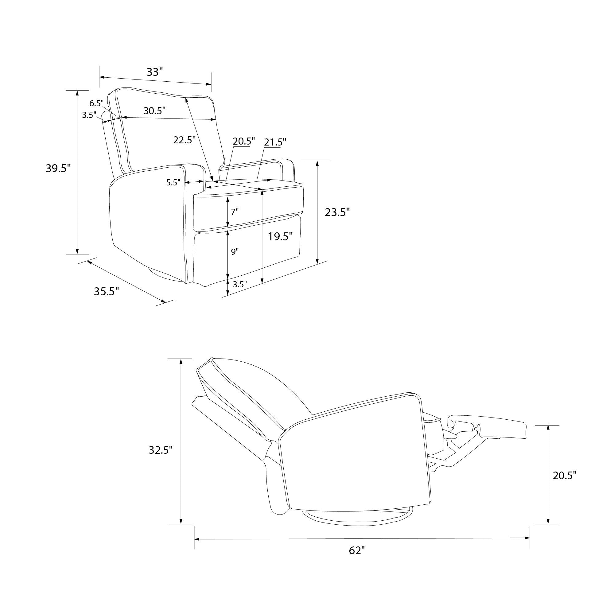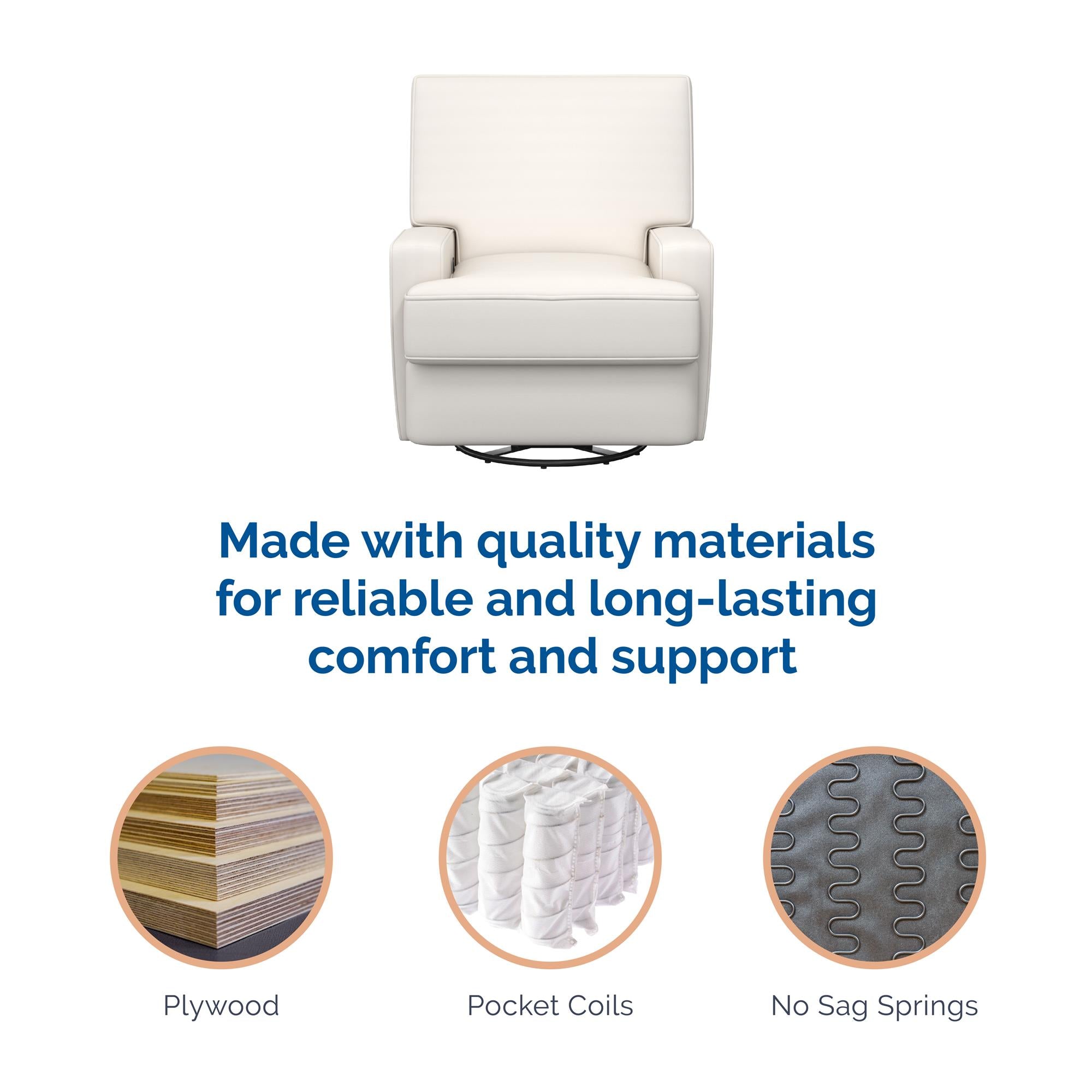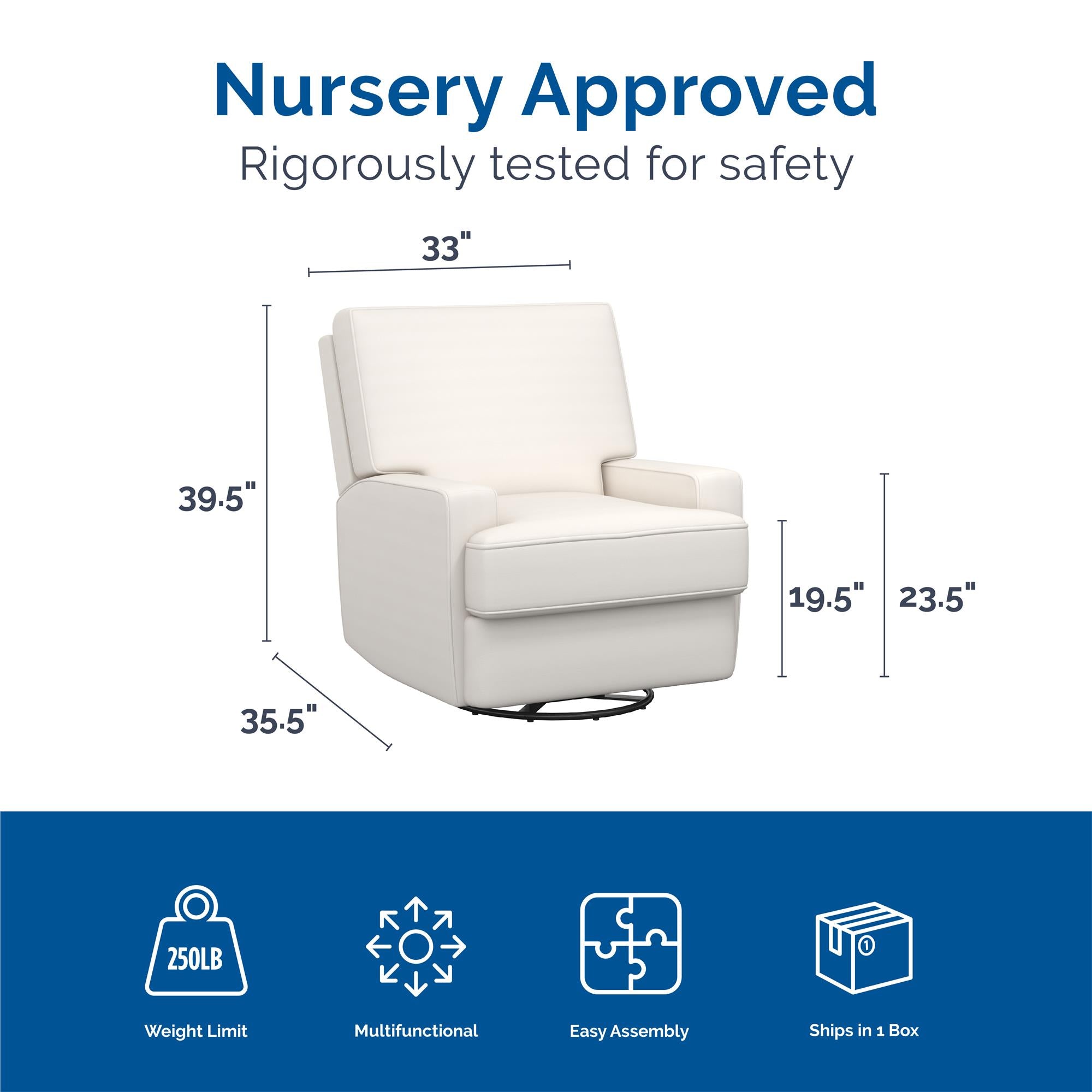 Rest up buttercup, our 4-in-1 Baby Relax Rylan Swivel Glider Rocker Recliner will let your infant doze off comfortably with its sleep-inducing rocking, gliding, reclining, and 360-degree swivel chair motions. A modern nursery must-have, parents need a break and the Rylan's plushy cushioned backrest, padded track armrests, and pocketed coil foam layered T-cushion seat offer just the right amount of comfort to make late night feedings less stressful. Tucked in between the seat and inner arm, you'll find an easy pull lever that moves you into a relaxed pushback recline position with a lift up footrest for achy legs. Smooth-edged with classic square lines and soft easy-clean upholstery, our chair can be placed in any living room and bedroom without skipping a style beat. Crafted for durability and expertly tested for safety, the Rylan's secure plywood frame, no-sag spring foundation, steel recline mechanism, and heavy-duty metal base build are thoroughly supportive and flame-retardant chemical free. Saving you time and effort, allot only 15 minutes for assembly.