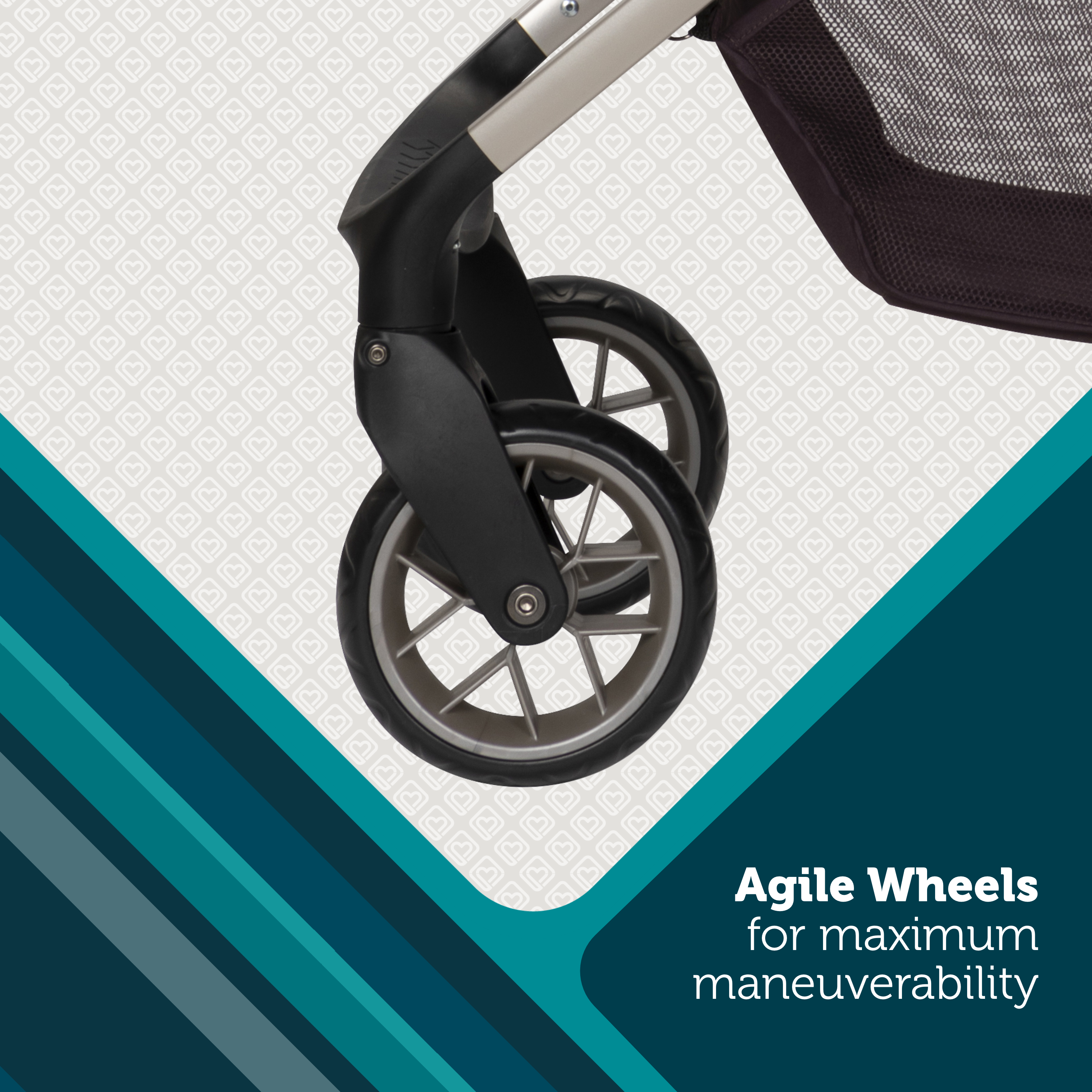 With eight different strolling options for parents on the go, the Safety 1st Deluxe Grow and Go Flex 8-in-1 Travel System is the only travel system you’ll need. It includes the Grow and Go stroller for children from birth through the preschool years, as well as the extended-use onBoard™ FLX infant car seat (for children 4–30 lbs.), a lightweight, easy-to-carry seat with newborn inserts, and a machine-washable, dryer-safe seat pad for easy cleanup. The stroller also features a large canopy with a peek-a-boo window, storage basket, child and parent trays with cup holders, a faux-leather handle, and an easy, compact fold for on-the-go portability. Parents will love its maneuverability, and kids will love the comfortable memory-foam seat and sippy cup holder.