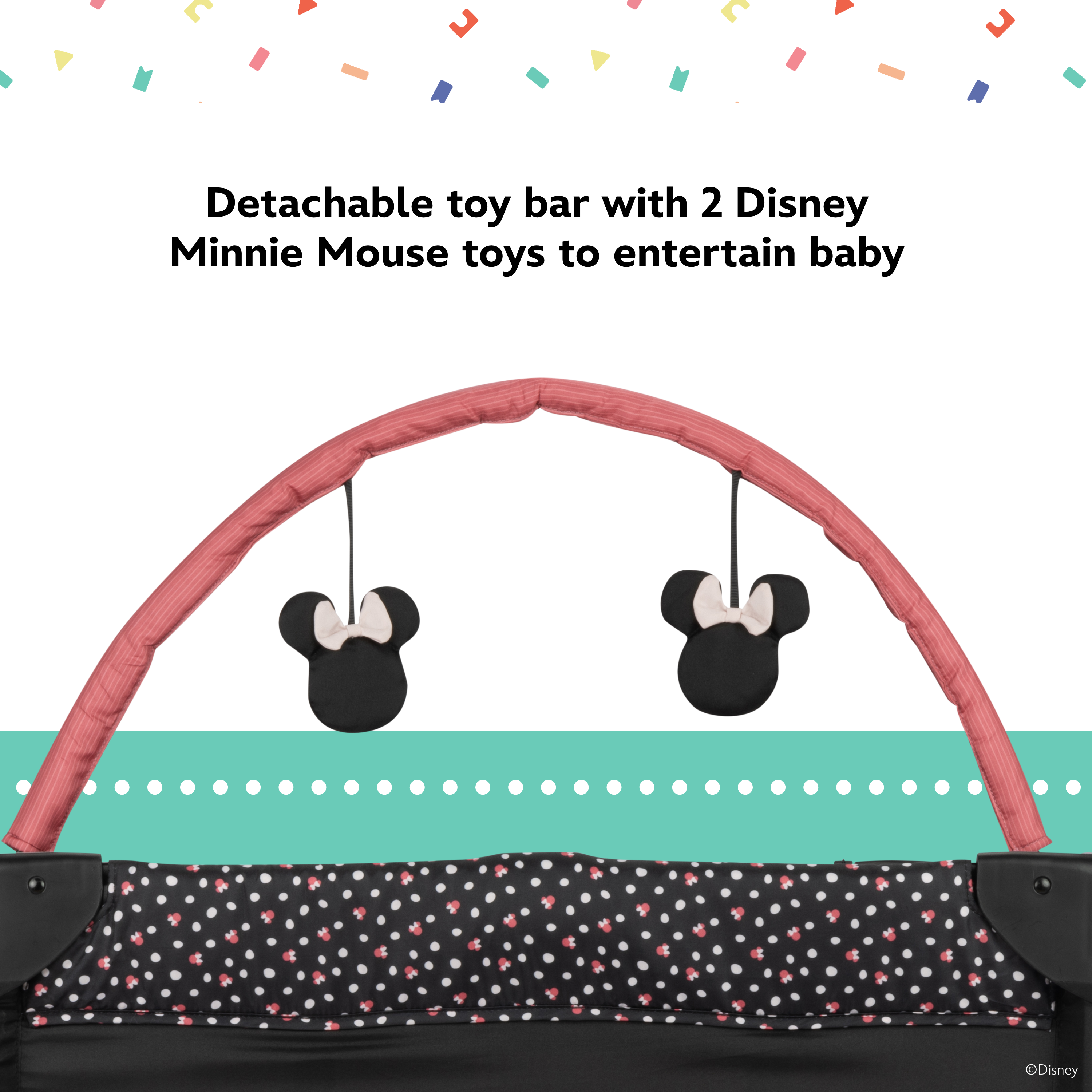 When your newborn is awake and curious, they’ll be fascinated by the detachable plush toy bar with Minnie or Mickey’s classic ears. Then, when it’s naptime, place them in the full-size, zip-in bassinet. If gentle movement helps them sleep, change from stationary mode to rocking mode, and help your little one drift off to dreamland.