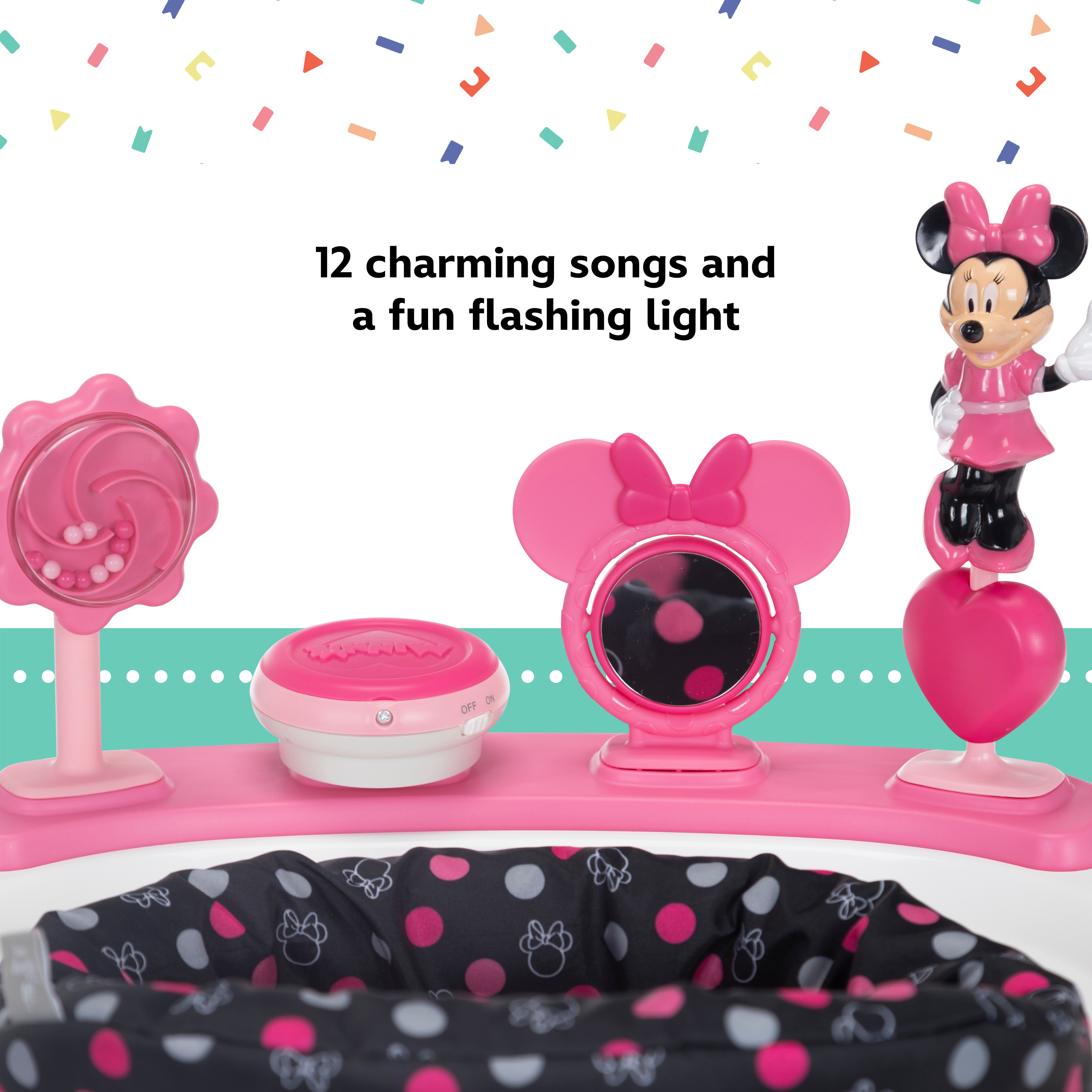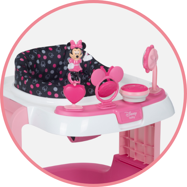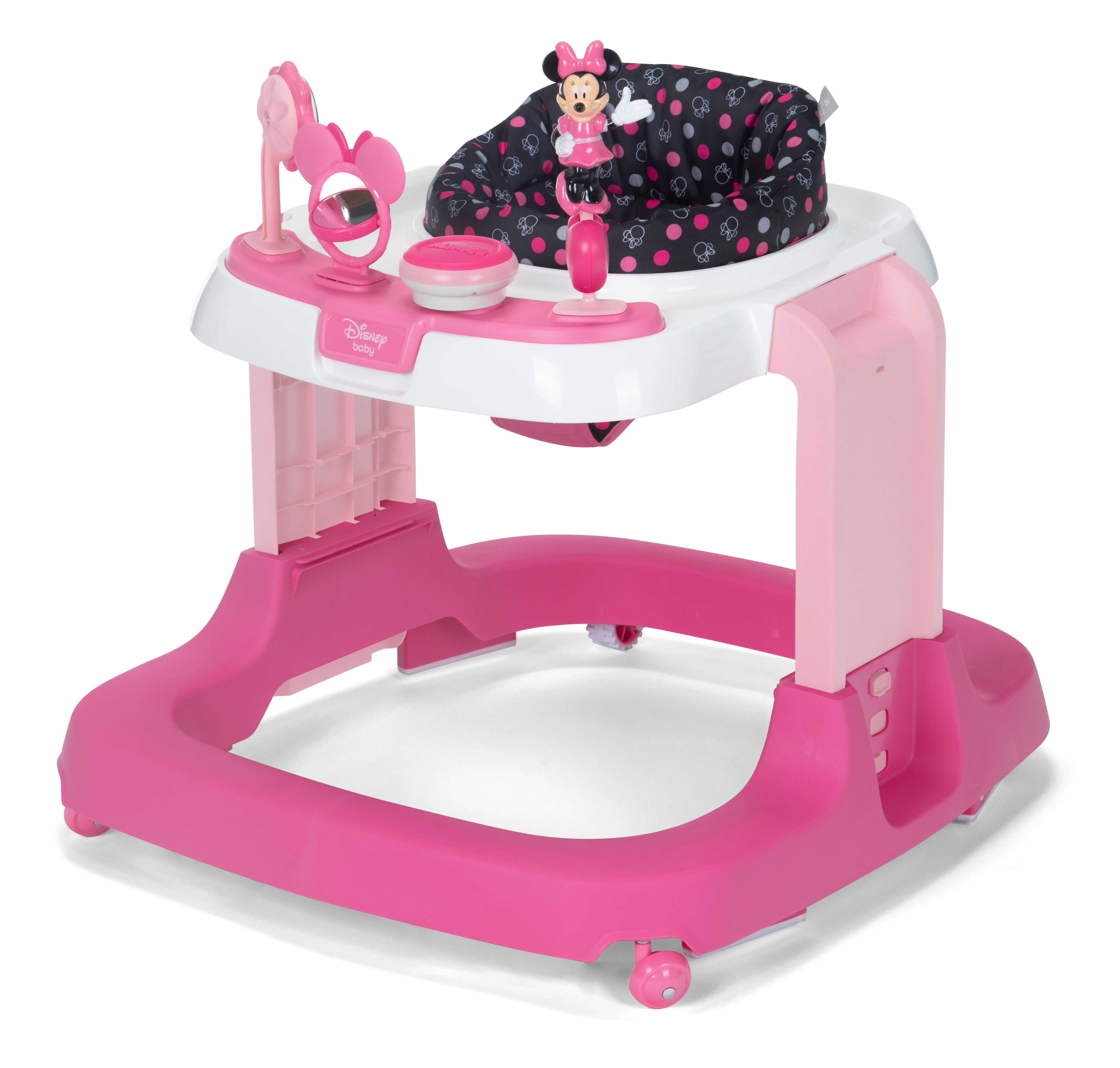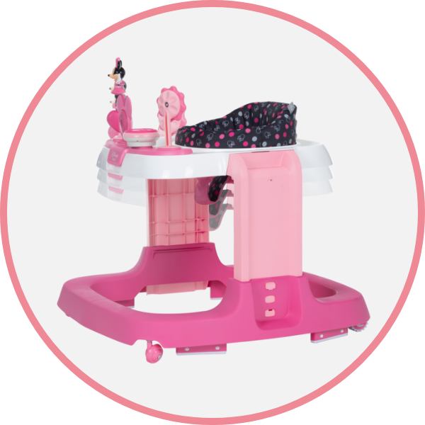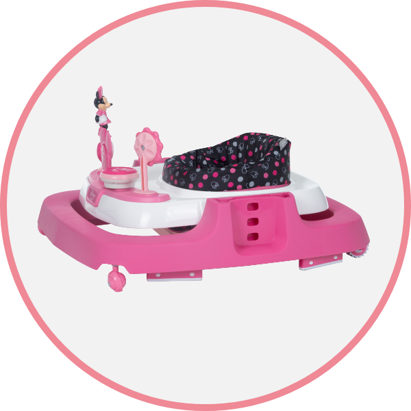 With the Disney Baby Ready, Set, Walk DX Developmental Walker your little one can stretch their legs while being entertained with fun toys featuring a favorite Disney friend. The three-position height adjustment offers the right height and fit to encourage those first steps. The developmental baby walker also supports your child with an extra-wide base that makes it easier to stay upright. There are multiple developmental activities and 12 different songs designed to amuse and delight while stimulating a baby’s visual and auditory senses. The tray is a great place for snack time and the machine-washable seat pad makes it easy to clean up after snack time messes. The developmental baby walker nests and locks easily into a compact shape for storage or trips away from home. With a maximum weight of 30 pounds, it’s an excellent option for babies getting ready to walk.