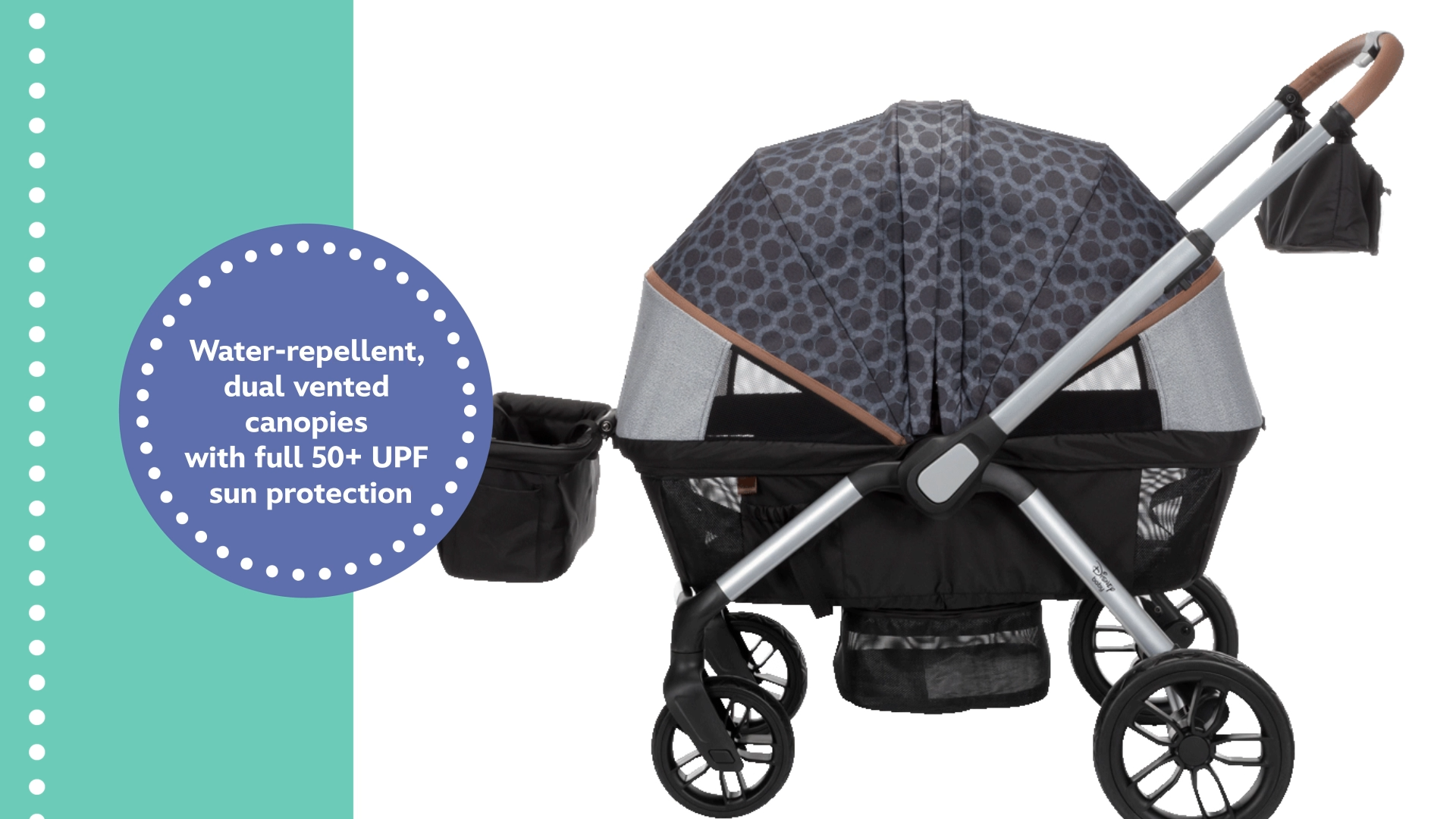 Feel free to roam off the beaten path with the Disney Baby® Summit™ Wagon Stroller by Safety 1st, equipped with two extra-comfortable memory-foam seats and dual vented canopies with 50+ UPF sun protection. Parents will love the ease and maneuverability of this go-everywhere wagon, which features a 3-position telescoping handle that reverses for pushing or pulling, all-terrain wheels with rear suspension, and plenty of storage. Don’t want to take the baby out of their car seat? No problem. Just click your infant seat (not included) into the Summit Wagon Stroller with the included adapters. In between adventures, the Summit Wagon Stroller easily folds up for compact, self-standing storage. It also includes adapters compatible with most Safety 1st® and Cosco Kids™ infant car seats (not included). Designed for Disney fans, you’ll enjoy Mickey’s iconic ears featured in the stylish pattern which sets this wagon stroller apart from the rest.