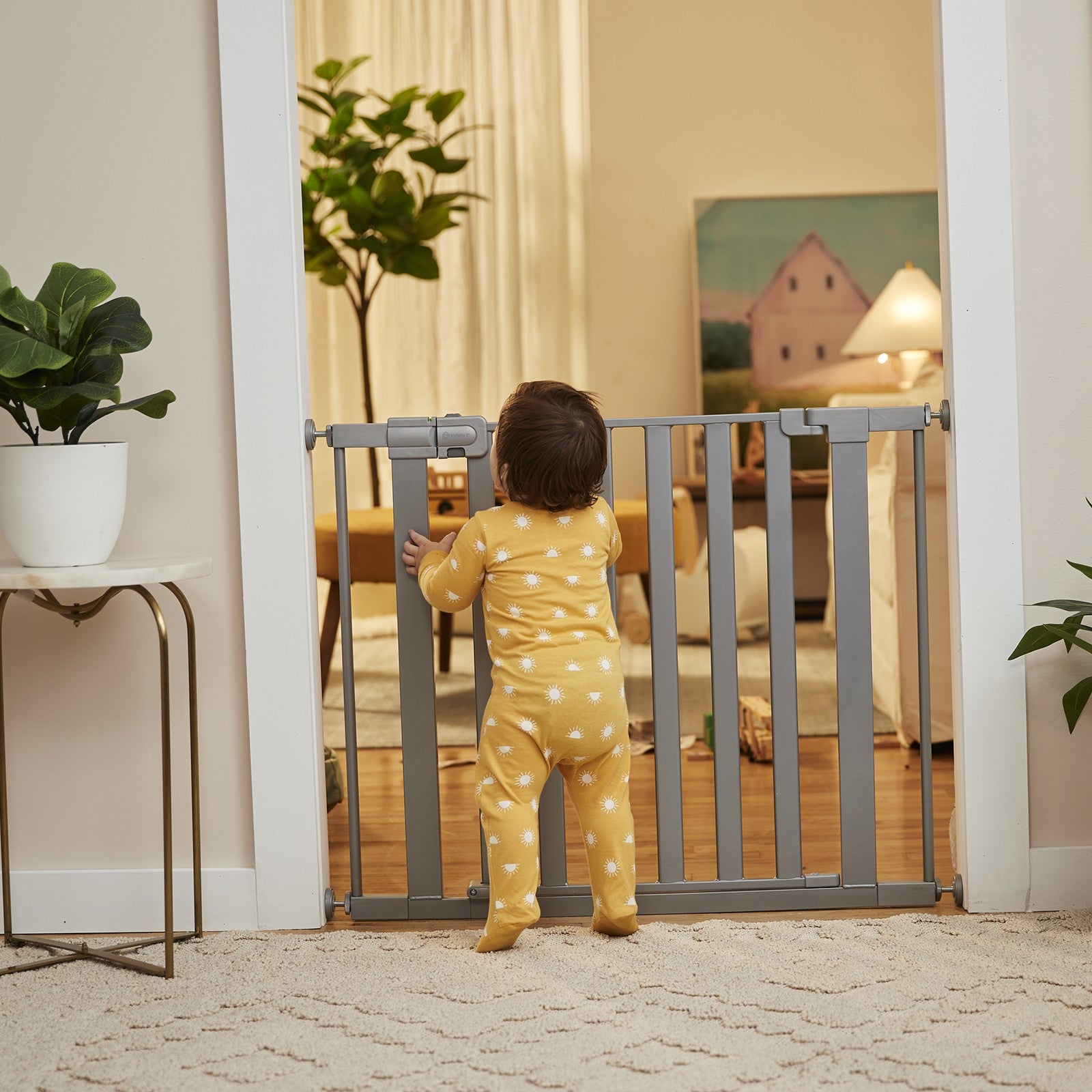 Now that your baby is on the move, create child-friendly spaces in your home. For use between rooms, Safety 1st's Modern Easy-Install Gate’s flat-slat design, sleek styling, and modern finish add the perfect touch to your home décor. The walk-through style makes it easy to get around the house, with no need to reinstall each time you pass by. This gate also features SecureTech®, our red-to-green indicator on the top rail that allows you to see when your gate is securely locked.