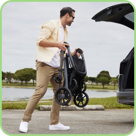 Easy-to-fold stroller folds flat and has removable back wheels for compact storage