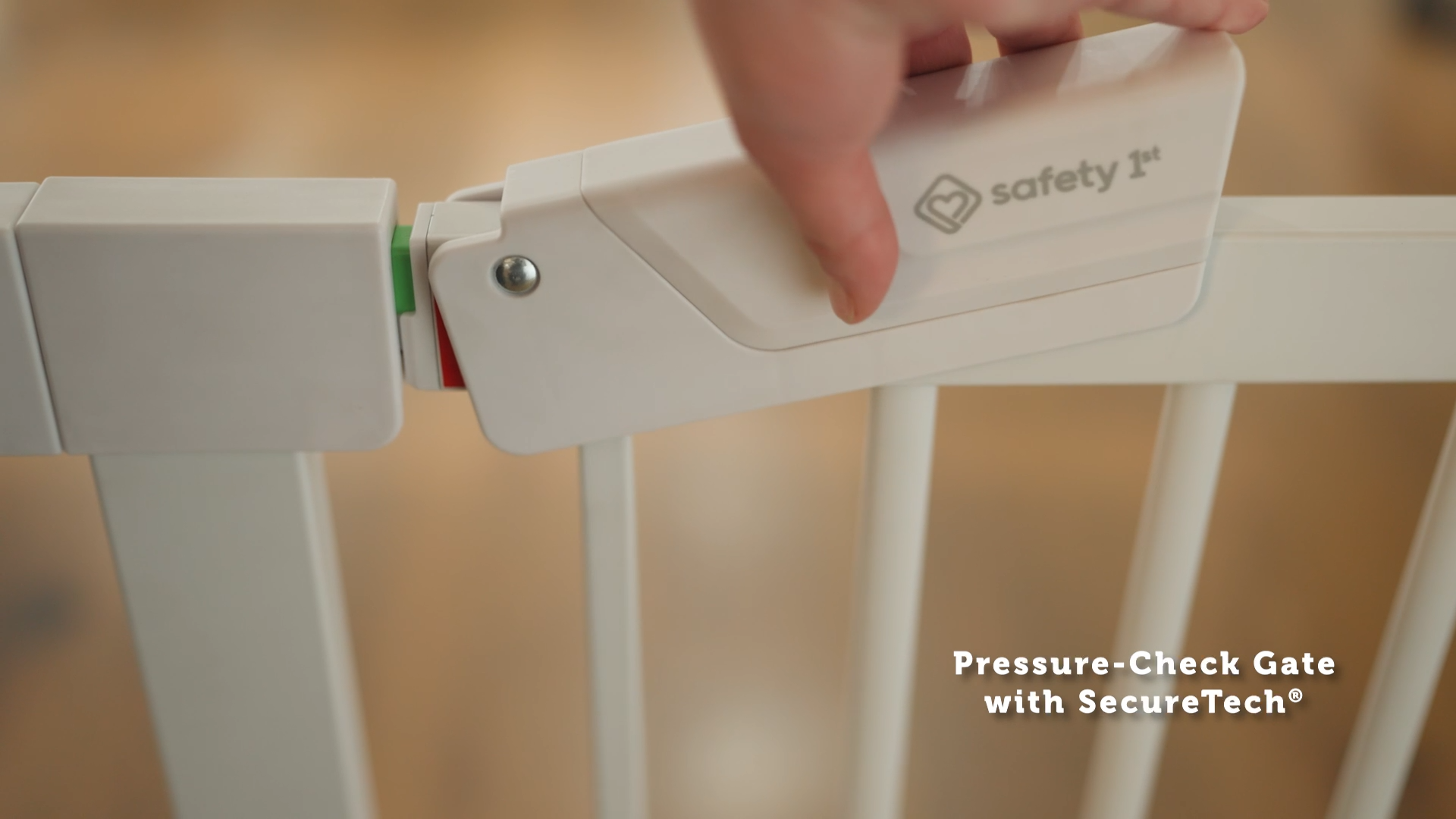 The Safety 1st Pressure-Check Gate with SecureTech® can be used between rooms to create child-friendly areas for your little one to explore. The gate includes red-to-green SecureTechTM visual indicators on the top and bottom rails that let you know if the gate is correctly latched and properly pressurized. The innovative design eliminates the need for added hardware or drilling into the wall.