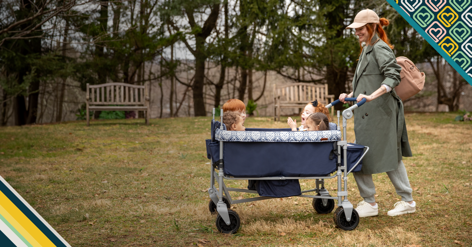 The Summit Quad Wagon Stroller can either be pulled from the front handle like a traditional wagon or pushed like a stroller with the fold-away back handlebar. There’s plenty of storage with 4 storage pockets on the inside, 2 on the outside, and an extra fold-away basket. The removable canopy with UV protection can be tilted and adjusted as needed. After each adventure, the wagon folds up with 1 hand for quick and easy storage.