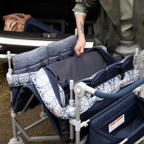 The Summit Quad Wagon Stroller can either be pulled from the front handle like a traditional wagon or pushed like a stroller with the fold-away back handlebar. There’s plenty of storage with 4 storage pockets on the inside, 2 on the outside, and an extra fold-away basket. The removable canopy with UV protection can be tilted and adjusted as needed. After each adventure, the wagon folds up with 1 hand for quick and easy storage.